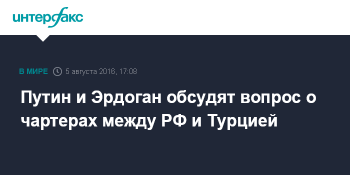 Москва. 5 августа. INTERFAX.RU - Вопрос возобновления чартерного авиасообщения между Россией и Турцией будет обсуждаться на встрече президентов Владимира Путина и Реджепа Эрдогана, сообщил помощник президента Юрий Ушаков.