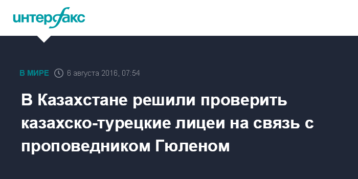Москва. 6 августа. INTERFAX.RU - Совместная рабочая группа из представителей министерств образования Казахстана и Турции проверит кахахско-турецкие лицеи (КТЛ) в Казахстане на причастность к оппозиционному деятелю Фетхуллаху Гюлену, сообщило госагентство "Казинформ", цитируя президента Нурсултана Назарбаева.
