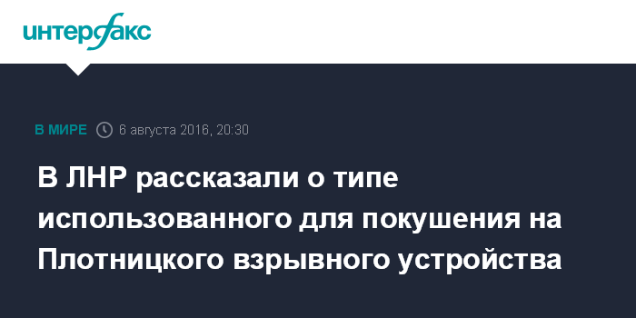 Москва. 6 августа. INTERFAX.RU - Мощность взрыва, в результате которого пострадал глава самопровозглашенной Луганской народной республики Игорь Плотницкий, составляла 10-15 кг в тротиловом эквиваленте, сообщает "Луганский информационный центр" (ЛИЦ) со ссылкой на пресс-службу Министерства госбезопасности ЛНР.