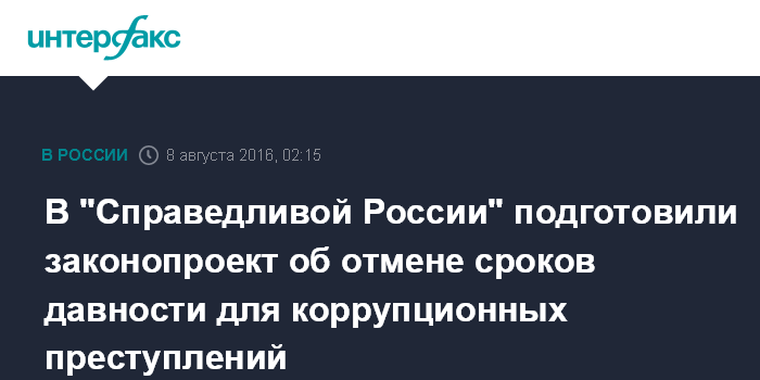"В понедельник соответствующие поправки в статью 78 Уголовного кодекса РФ в части неприменения сроков давности к лицам, совершившим коррупционные преступления", - будут внесены в Госдуму", - сообщила пресс-служба фракции"Справедливая Россия".
