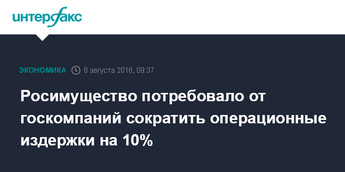 Москва. 8 августа. INTERFAX.RU - Росимущество потребовало от госкомпаний на 10% снизить операционные издержки и представить в правительство план, как они это сделают, сообщают в понедельник "Ведомости".