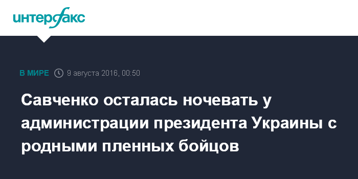 Москва. 9 августа. INTERFAX.RU - Народный депутат Украины Надежда Савченко (фракция "Батькивщина") вместе с матерями и родными украинских бойцов, которые находятся в плену у боевиков на Донбассе, проводит ночь у здания администрации президента (АП) в центре Киева.