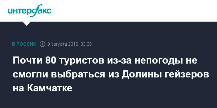 Москва. 9 августа. INTERFAX.RU - 75 туристов, прилетевших в понедельник на двухчасовую экскурсию в Долину гейзеров, расположенную на территории Кроноцкого заповедника на Камчатке, из-за непогоды не могут вылететь оттуда, сообщила агентству "Интерфакс" в понедельник пресс-секретарь заповедника Инна Мамаева.