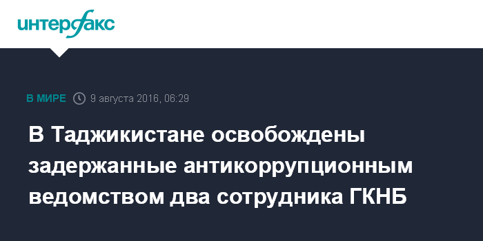 Москва. 9 августа. INTERFAX.RU - Два высокопоставленных чиновника госкомитета национальной безопасности (ГКНБ) Таджикистана, задержанные в конце июля сотрудниками агентства по государственному финансовому контролю и борьбе с коррупцией, освобождены.