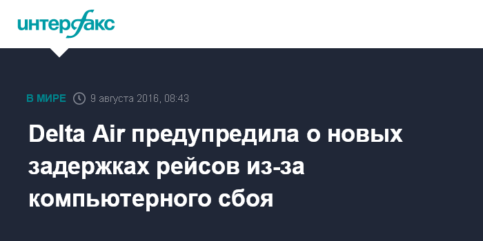 Москва. 9 августа. INTERFAX.RU - Американская авиакомпания Delta Air Lines предупредила о возможном продолжении отмен и задержки рейсов из-за неполадок в компьютерной системе.