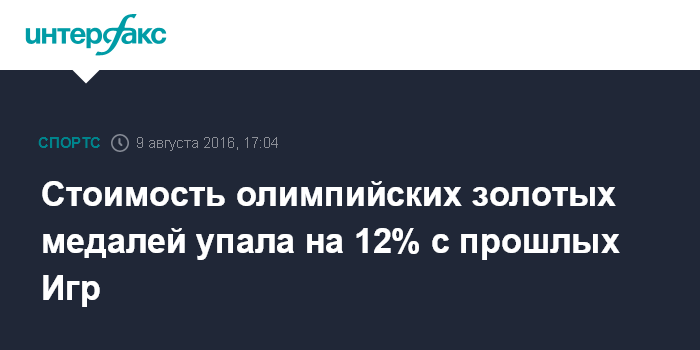 Москва. 9 августа. INTERFAX.RU - Номинальная стоимость золотой медали на Олимпиаде в Рио упала на 12% по сравнению с "золотом" лондонской Олимпиады, хотя вес награды высшего достоинства вырос до рекордных в истории 500 граммов, пишет MarketWatch.