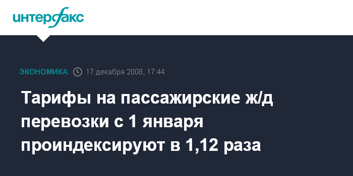 Москва. 17 декабря. INTERFAX.RU - Правление Федеральной службы по тарифам (ФСТ) приняло решение об индексации с 1 января тарифов на пассажирские железнодорожные перевозки в среднем в 1,12 раза.