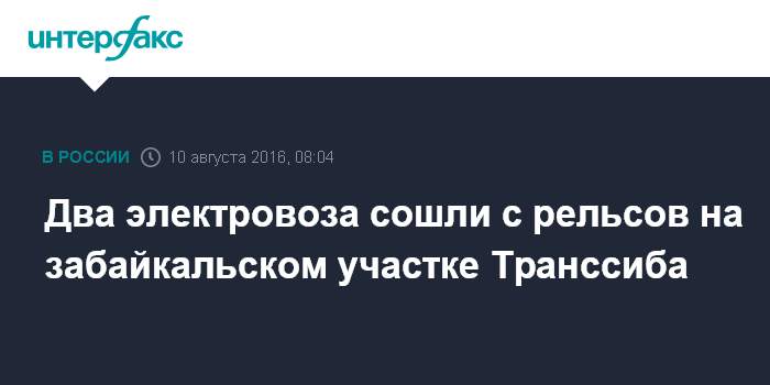 Москва. 10 августа. INTERFAX.RU - Два электровоза и тележка головного вагона почтово-багажного поезда сошли с рельсов на станции Ерофей Павлович Забайкальской железной дороги (ЗабЖД), говорится в пресс-релизе железной дороги в среду.