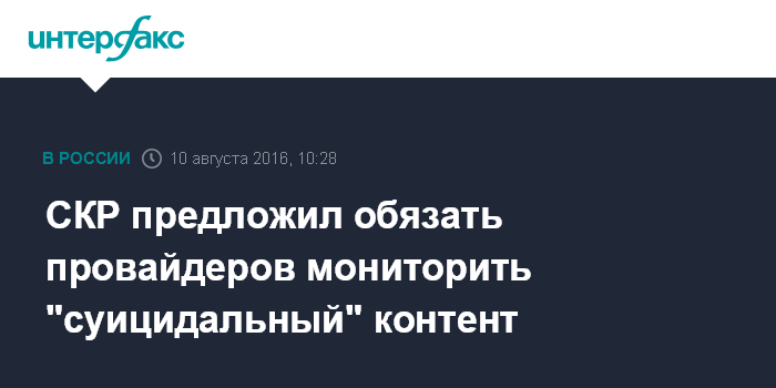 Москва. 10 августа. INTERFAX.RU - СКР предлагает принять меры к тому, чтобы интернет-провайдеры и операторы не размещали на своих ресурсах опасный контент, провоцирующий подростковые суициды.