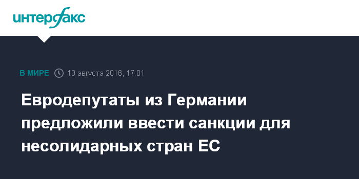 Москва. 10 августа. INTERFAX.RU - Немецкие евродепутаты, считающие, что Германия больше других стран вкладывается в бюджет Европейского союза, тогда как наибольшую выгоду из членства в ЕС извлекают Польша и Чехия, предложили ввести санкции, чтобы мотивировать их к солидарности, сообщает Deutsche Welle.