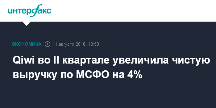 Москва. 11 августа. INTERFAX.RU - Qiwi plc во втором квартале 2016 года получила скорректированную чистую выручку по МСФО в размере 2,619 млрд рублей, увеличив ее на четыре процента по сравнению со вторым кварталом 2015 года, говорится в сообщении компании.