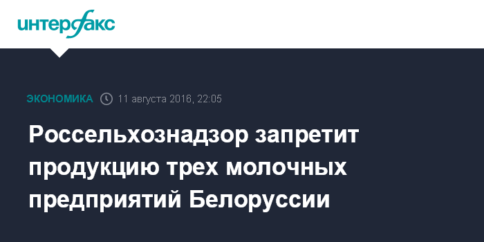 Москва. 11 августа. INTERFAX.RU - Россельхознадзор с 13 августа запрещает поставки продукции трех молочных предприятий Белоруссии.