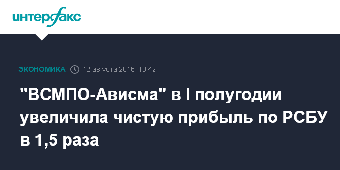 Москва. 12 августа. INTERFAX.RU - ПАО "Корпорация "ВСМПО-Ависма" в январе-июне 2016 года увеличило чистую прибыль, рассчитанную по РСБУ, на 52% по сравнению с первым полугодием 2015 года - до 13,66 млрд рублей, говорится в квартальном отчете компании.