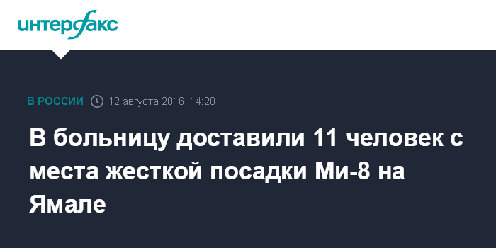 Москва. 12 августа. INTERFAX.RU - Гражданские вертолеты авиакомпании "Ямал" доставили в Салехард 11 человек, находившихся в военном вертолете Ми-8, который в пятницу совершил жесткую посадку в Ямало-Ненецком автономном округе. Об этом сообщила агентству "Интерфакс" пресс-секретарь губернатора ЯНАО Наталья Хлопунова.