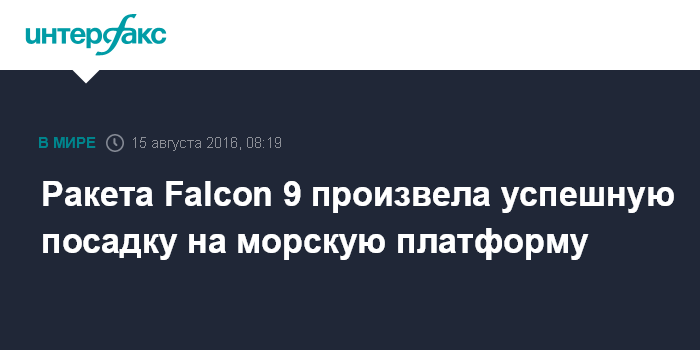 Москва. 15 августа. INTERFAX.RU - Ракета Falcon 9, которая в воскресенье вывела на орбиту японский телекоммуникационный спутник, произвела успешную посадку на морскую платформу в Атлантическом океане, сообщила компания-оператор SpaceX.