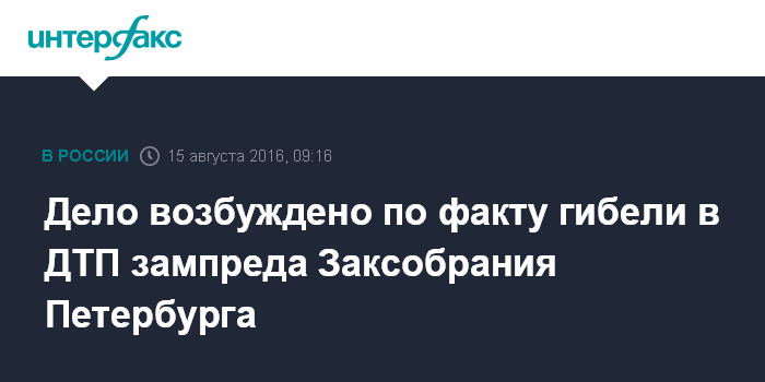 Москва. 15 августа. INTERFAX.RU - По факту гибели в дорожной аварии заместителя председателя Законодательного собрания Санкт-Петербурга Павла Солтана возбуждено уголовное дело, сообщили "Интерфаксу" в понедельник в пресс-службе ГУ МВД по Петербургу и Ленинградской области.