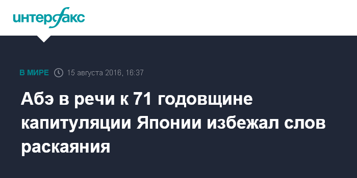 Москва. 15 августа. INTERFAX.RU - Премьер-министр Японии Синдзо Абэ, выступая в понедельник с заявлением, приуроченным к 71 годовщине капитуляции страны во Второй мировой войне, не упомянул, в отличие от своей прошлогодней речи, о глубоком раскаянии за политику японской власти того времени.