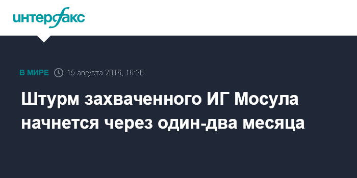 Москва. 15 августа. INTERFAX.RU - Окончательная фаза освобождения города Мосул в Ираке от террористов "Исламского государства" (запрещенная в РФ группировка) начнется через один-два месяца, заявил глава представительства Иракского Курдистана в Москве Асо Талабани.