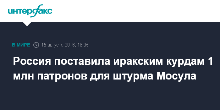 "Россия около двух недель назад отправила еще один самолет в Эрбиль. В основном там были патроны для автоматов и пулеметов Калашникова, около 1 млн патронов. Они предназначены для подготовки к штурму Мосула", - сказал Талабани "Интерфаксу".