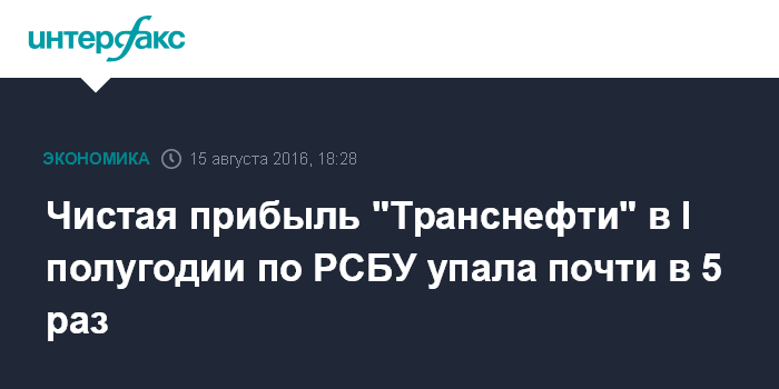 Москва. 15 августа. INTERFAX.RU - Чистая прибыль "Транснефти" за первое полугодие 2016 года по РСБУ упала по сравнению с аналогичным периодом прошлого года почти в пять раз - до 9,9 млрд рублей, свидетельствует отчет компании.