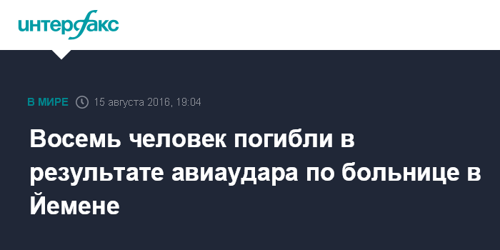 Москва. 15 августа. INTERFAX.RU - По меньшей мере, восемь человек погибли, еще 20 человек получили ранения в результате удара авиации возглавляемой Саудовской Аравией коалиции по больнице организации "Врачи без границ" в провинции Хадджа на севере Йемена, сообщил в понедельник иранский телеканал Press TV.