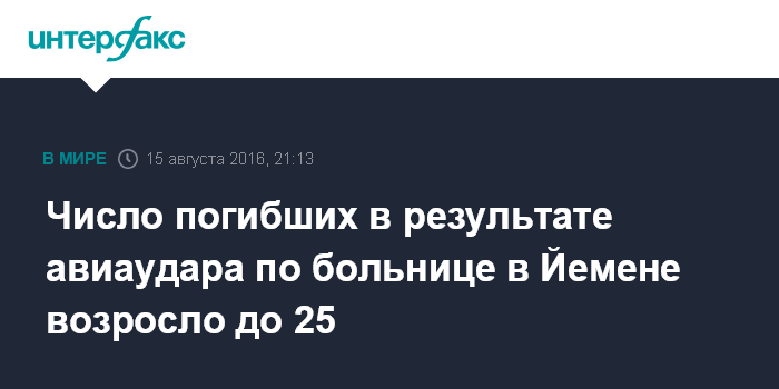 Москва. 15 августа. INTERFAX.RU - Не менее 25 мирных жителей погибли, еще 20 получили ранения в результате авиаудара силами, возглавляемой Саудовской Аравией коалиции, по больнице в провинции Хадджа на севере Йемена, сообщил в понедельник йеменский телеканал "аль-Масира".