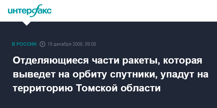 Москва. 18 декабря. INTERFAX.RU - После запуска группы космических аппаратов системы "Глонасс" ракетой-носителем "Протон-М" с космодрома Байконур ее отделяющиеся части упадут на территорию Томской области, сообщает пресс-служба областной администрации.