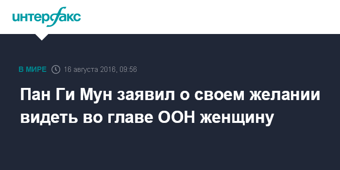 Москва. 16 августа. INTERFAX.RU - Генсек ООН Пан Ги Мун заявил, что после его ухода с этого поста хотел бы видеть во главе организации женщину, сообщает во вторник агентство Associated Press.