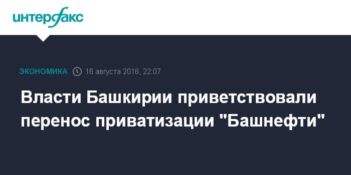 Москва. 16 августа. INTERFAX.RU - Башкирия, которая владеет 25% акций НК "Башнефть", приветствует решение правительства РФ перенести приватизацию федерального пакета компании.