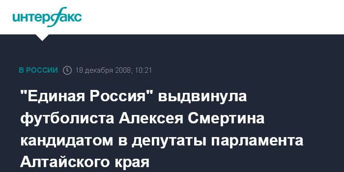 Москва. 18 декабря. INTERFAX.RU - Футболист Алексей Смертин может стать депутатом Законодательного собрания Алтайского края.