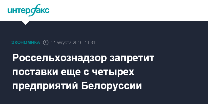 Москва. 17 августа. INTERFAX.RU - Россельхознадзор запрещает поставки продукции еще с четырех предприятий Белоруссии.