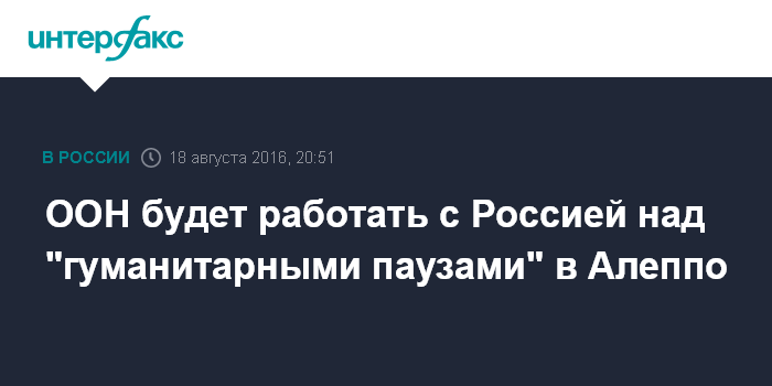 Москва. 18 августа. INTERFAX.RU - Специальный посланник генсека ООН в Сирии Стаффан де Мистура намерен работать с Россией над выработкой деталей 48-часовой гуманитарной паузы в сирийском городе Алеппо.