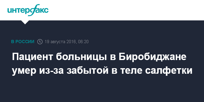 Москва. 19 августа. INTERFAX.RU - Житель Биробиджана в Еврейской АО скончался из-за забывчивости врачей, которые, делая операцию, оставили в его теле марлевую салфетку.