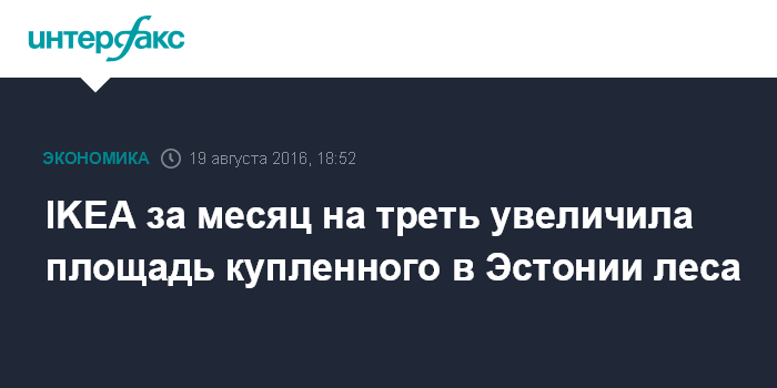 Москва. 19 августа. INTERFAX.RU - Дочернее предприятие концерна IKEA, компания IRI Investments Estonia OU, за последний месяц скупило в Эстонии около 1,4 тыс. га леса, при этом общая площадь принадлежащих компании участков леса возросла на треть - до 5,3 тыс. га, сообщили BNS в IKEA Group.