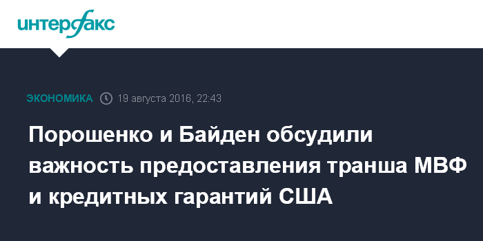 Москва. 19 августа. INTERFAX.RU - Президент Украины Петр Порошенко и вице-президент США Джо Байден в рамках телефонного разговора обсудили важность предоставления в ближайшее время транша Международного валютного фонда и кредитных гарантий США.