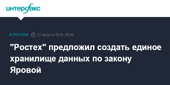 Москва. 22 августа. INTERFAX.RU - Структура "Ростеха" - Национальный центр информатизации - предложила создать единый центр хранения и обработки данных для исполнения "закона Яровой", обязывающего операторов связи до полугода хранить весь трафик клиентов - звонки, письма, файлы, разговоры, а в течение трех лет - данные данные об этих фактах передачи информации, сообщает в понедельник газета "Ведомости".
