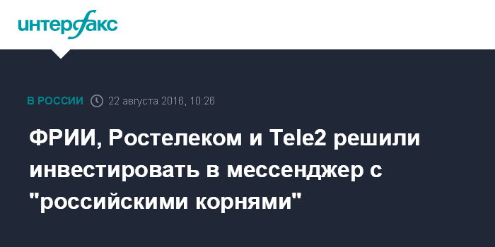 Москва. 22 августа. INTERFAX.RU - Фонд развития интернет-инициатив (ФРИИ) совместно с ПАО "Ростелеком" и ООО "Т2 РТК Холдинг" (оператор Tele2) рассмотрят возможность инвестировать в мессенджер с "российскими корнями", говорится в сообщении ФРИИ.