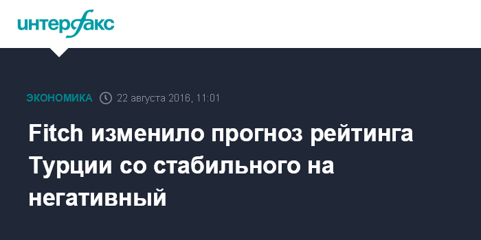 Москва. 22 августа. INTERFAX.RU - Международное рейтинговое агентство Fitch подтвердило долгосрочные рейтинги дефолта эмитента в иностранной и национальной валютах Турции на уровне "ВВВ-". Как сообщается в пресс-релизе агентства, прогноз изменен со "стабильного" на "негативный".