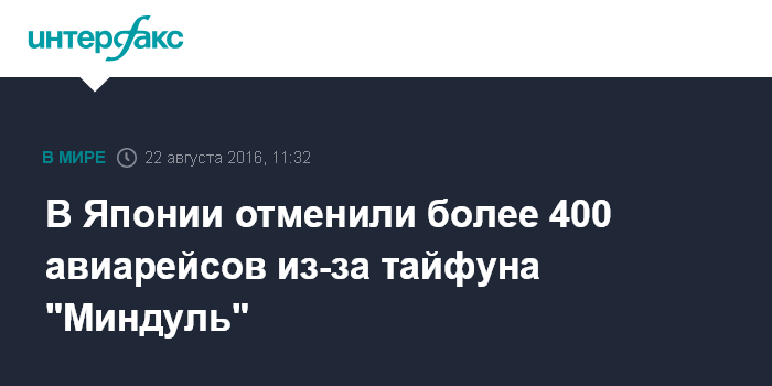 Москва. 22 августа. INTERFAX.RU - Тайфун "Миндуль", обрушившийся на восточные регионы Японии, включая регион Канто на острове Хонсю, привел к отмене более 400 авиарейсов, в том числе в международном аэропорту Токио "Ханэда", сообщают японские СМИ.