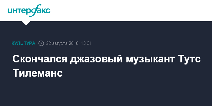 Москва. 22 августа. INTERFAX.RU - Бельгийский джазовый музыкант Тутс Тилеманс, получивший известность за манеру игры на губной гармонике, скончался в понедельник на 95-м году жизни, сообщает бельгийский телерадиоканал RTL.