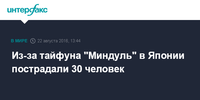 Москва. 22 августа. INTERFAX.RU - Не менее 30 человек получили различные травмы в результате удара тайфуна "Миндуль", обрушившегося в понедельник на восточные районы Японии, включая регион Канто на острове Хонсю, сообщает японский телеканал NHK.