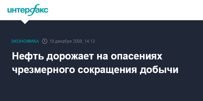 Москва. 18 декабря. INTERFAX.RU - Нефть дорожает на опасениях чрезмерного сокращения добычи, которое может превысить падение спроса в 2009 г., сообщило агентство Bloomberg.
