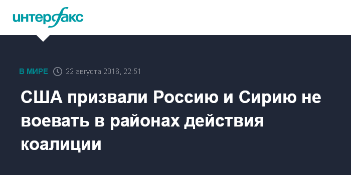 Москва. 22 августа. INTERFAX.RU - США дали понять как России, так и Сирии, что намерены защищать свой военный персонал в Сирии и призвали не осуществлять полеты военной авиации на опасном расстоянии.