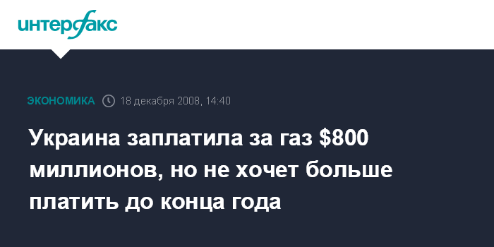 Москва. 18 декабря. INTERFAX.RU - Украина, переведя "Газпрому" $800 млн за поставки газа, уведомила российскую компанию, что до конца года больше не будет ей платить за поставки топлива (за ноябрь-декабрь), заявил журналистам официальный представитель "Газпрома".