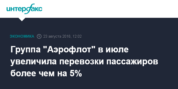 За семь месяцев 2016 г. группа перевезла 24,1 млн пассажиров, что на 9,4% больше, чем за тот же период 2015 г., авиакомпания "Аэрофлот" - 16,2 млн человек (на 10,9% больше). Пассажирооборот группы увеличился на 12,2%, пассажирооборот компании - на 11,3%, процент занятости пассажирских кресел - на 3,1 процентного пункта (до 80,6%) и на 1,8 процентного пункта (до 80,5%) соответственно.