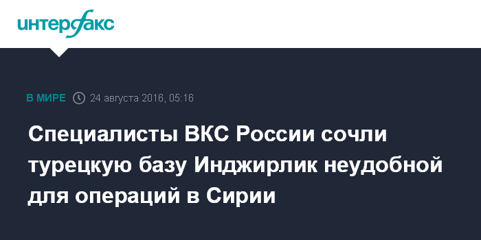 Москва. 24 августа. INTERFAX.RU - Турецкая база Инджирлик не готова для размещения российских боевых самолетов, участвующих в операциях против террористов в Сирии, и не обеспечивает решения всех поставленных боевых задач, пишут в среду "Известия" со ссылкой на источник, знакомый с ситуацией.