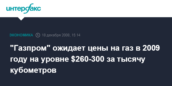 Москва. 18 декабря. INTERFAX.RU - "Газпром" ожидает, что мировые цены на газ в 2009 г. составят порядка $260-300 за тысячу кубометров, сообщил журналистам зампред правления "Газпрома" Александр Медведев.