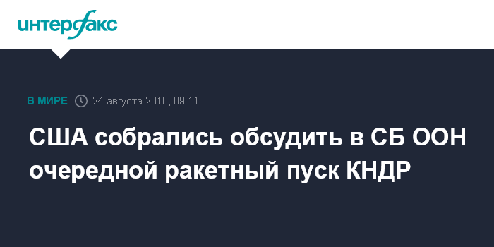 Москва. 24 августа. INTERFAX.RU - США намерены вынести на обсуждение СБ ООН вопрос о проведении КНДР очередного ракетного испытания, заявила представитель Пентагона Лаура Сил.