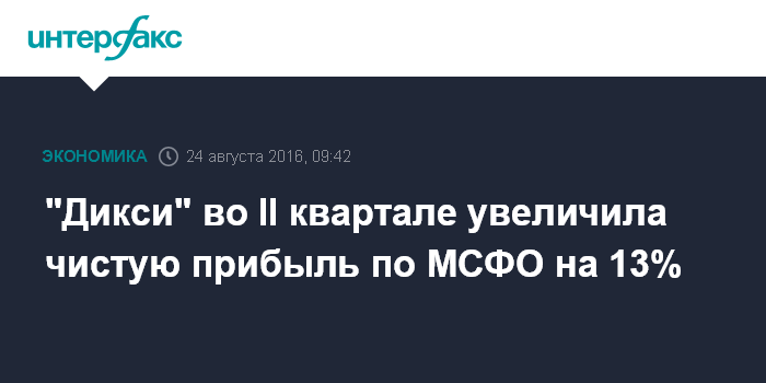 Москва. 24 августа. INTERFAX.RU - Чистая прибыль группы "Дикси" по МСФО во II квартале 2016 года выросла на 13,1% по сравнению с прошлогодним показателем, до 1,07 млрд рублей.