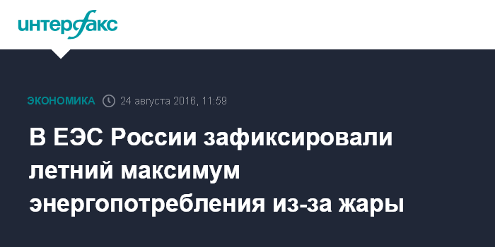 Москва. 24 августа. INTERFAX.RU - Потребление мощности в ЕЭС России достигло нового летнего исторического максимума - примерно 116,1 ГВт, сообщило АО "Системный оператор ЕЭС" (СО ЕЭС).